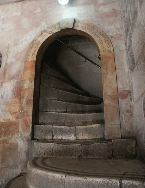 גרם מדרגות אבן צר עולה בין בנייני אבן גיר עתיקים בעיר העתיקה. חוטי חשמל חוצים את החלל מעל, ומעקות מתכת מלווים את המדרגות, ומדגישים את השילוב בין ארכיטקטורה עתיקה לתשתיות מודרניות.