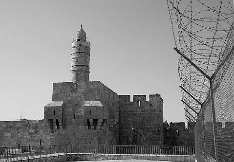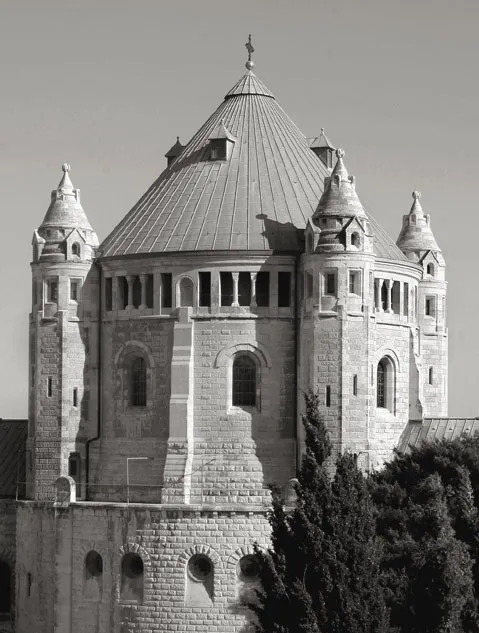 A black and white view of the Dormition Abbey, characterized by its large conical roof and four corner turrets. A cross stands atop the roof, while trees obscure the lower walls.