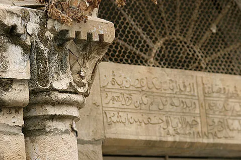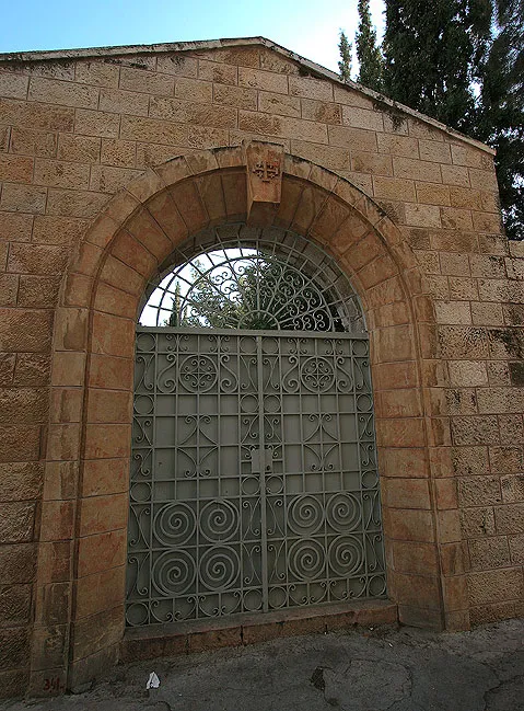 A low-angle view of the stone entrance to the St. Savior Armenian Convent, featuring a trilingual inscription in Armenian, French, and Arabic above a large wooden door with decorative iron grilles.