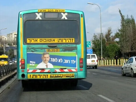 \ כרזה על אוטובוס ביציאה מירושלים