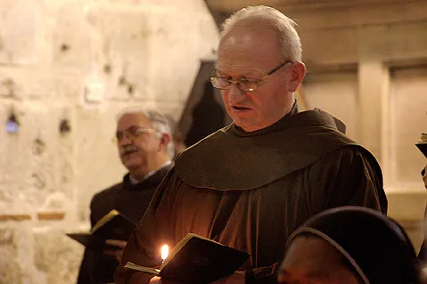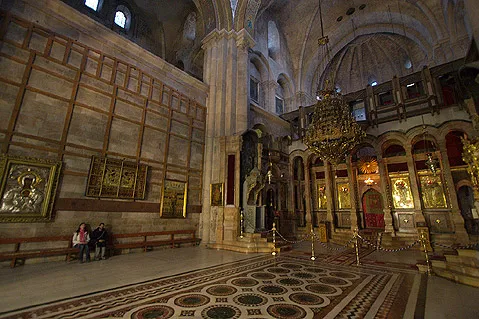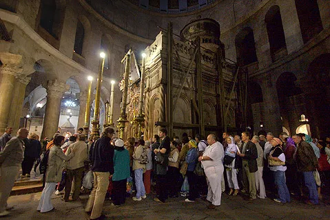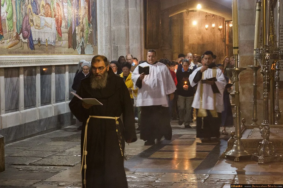 A narrow, stone-paved alleyway lined with souvenir shops displaying various goods. Pedestrians, including tourists and Orthodox Jewish men, stroll through the bustling market atmosphere.