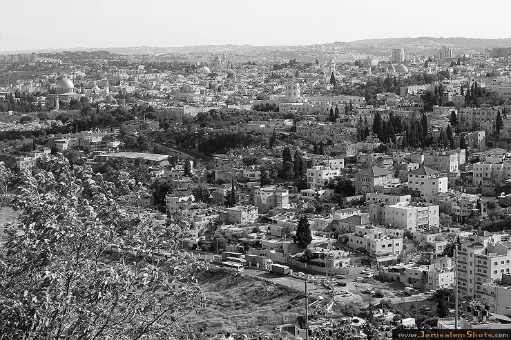 A black and white wide shot showing the dense urban landscape of Jerusalem's Old City, featuring prominent architectural features like domes and towers.