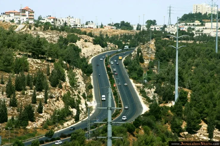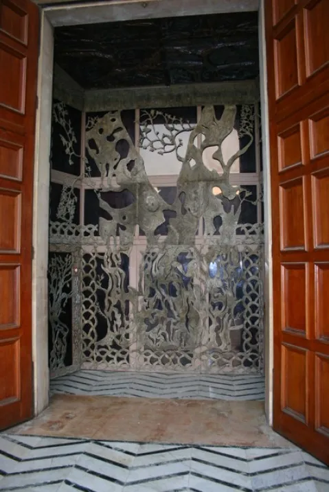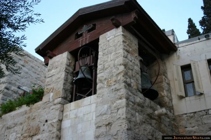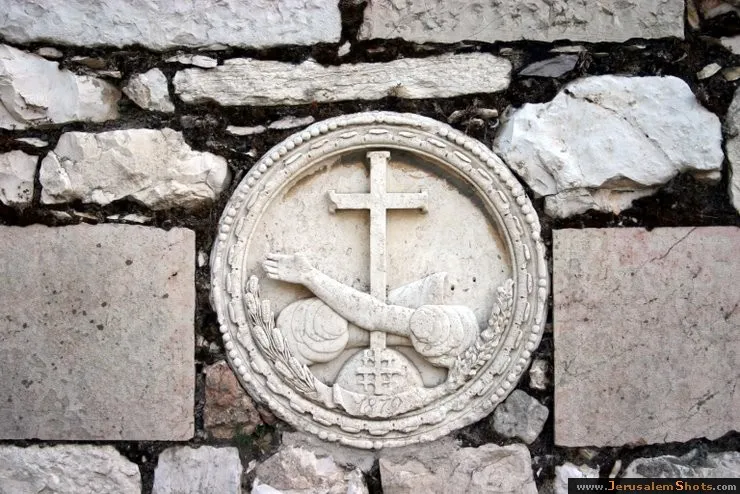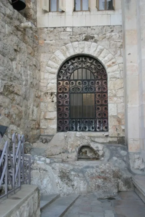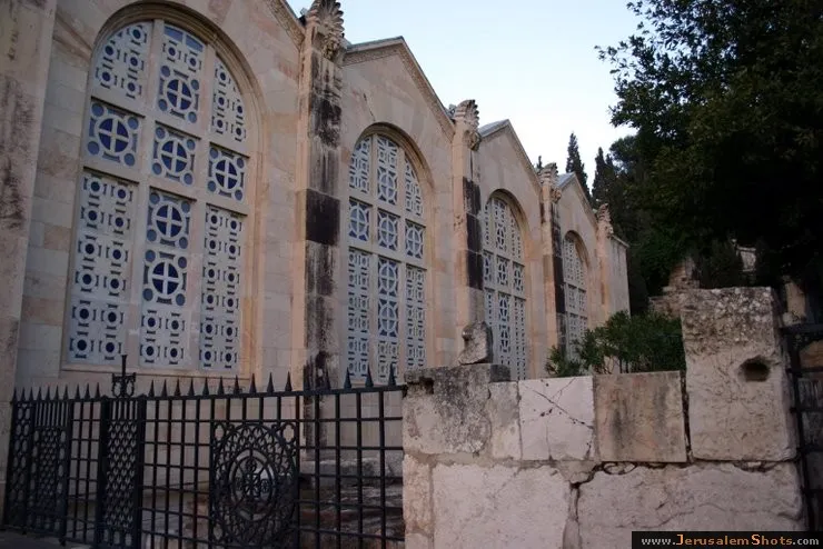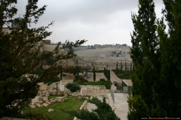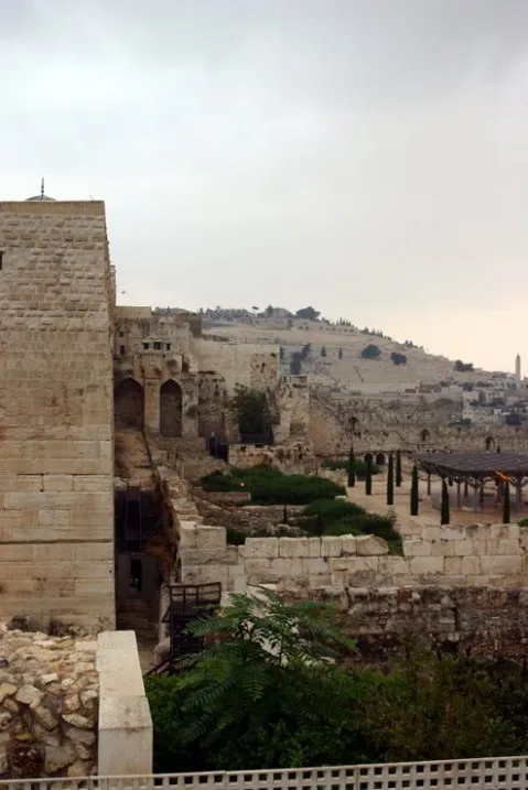 An elevated view of the stone walls and ancient buildings at night, with people walking through the plaza.