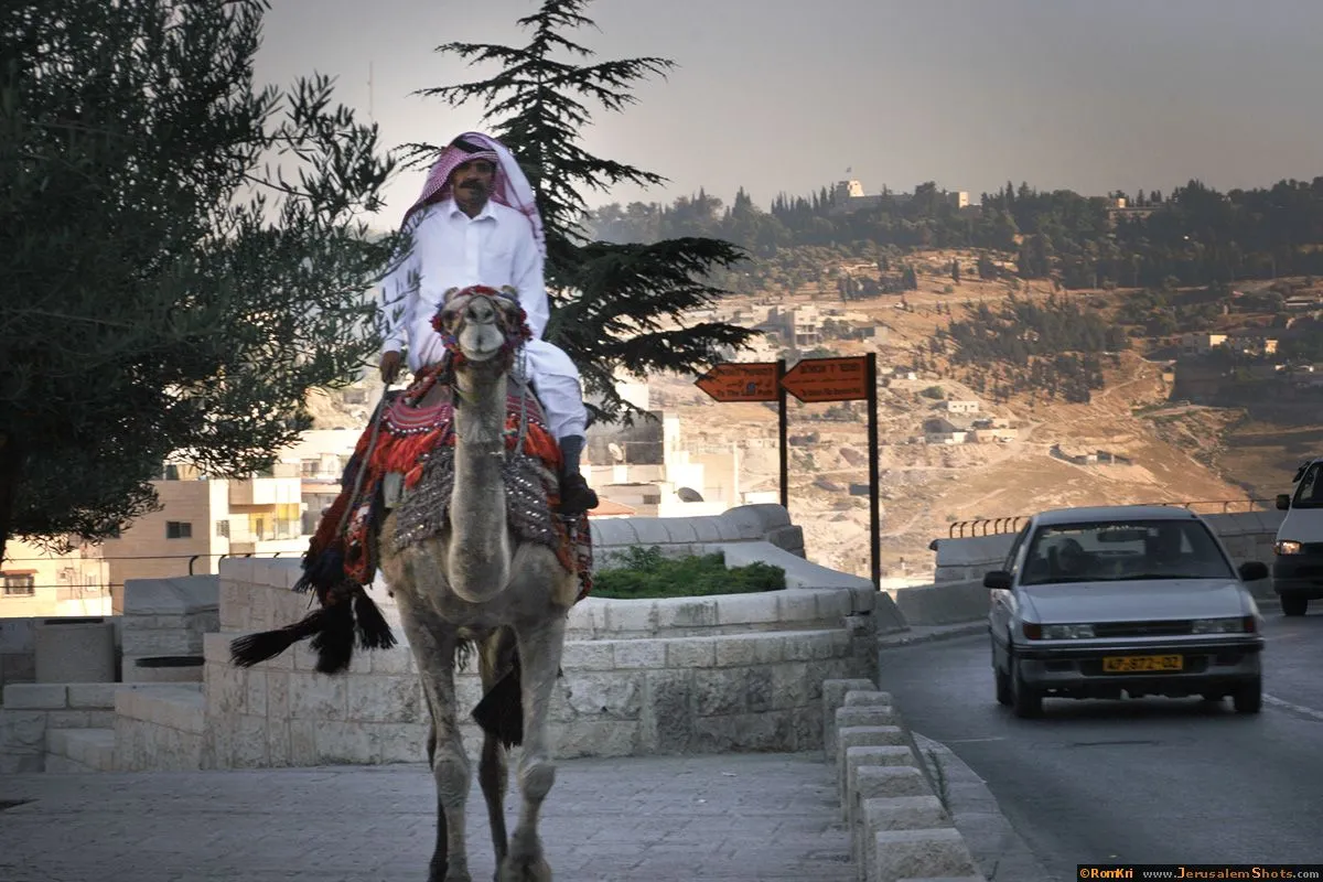 A man in traditional clothing riding a camel along a roadside in Jerusalem.