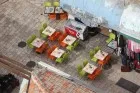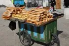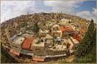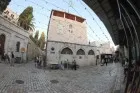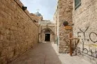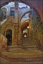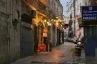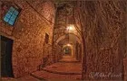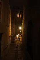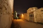 A quiet, dimly lit street at night, featuring stone walls and an old gate.