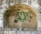 גומחת אבן שקועה מציגה גרפיטי בשכבות, כולל מגן דוד ירוק הצבוע מעל כתב ערבי וסמל שחור, המשקף את הנרטיבים המורכבים והמצטלבים הנמצאים על חומותיה העתיקות של ירושלים.
