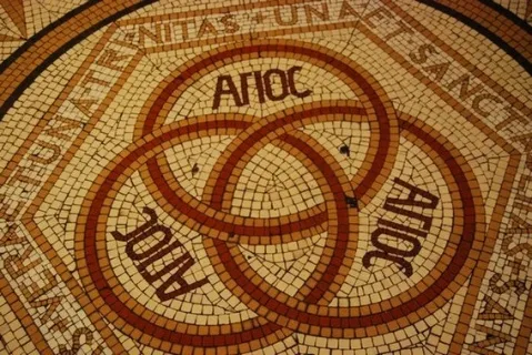 ברצפת כנסיית הדורמיציון צריך לומר דורמיסיון (התרדמת) בריצפת הפסיפסישציורים מדהימים כולם קשורים לדת כמובן כאן כתוב3 פעמים קדוש קדוש קדוש. צילום נופי דדוש אור יהודה. מומלץ לרדת למרתף.