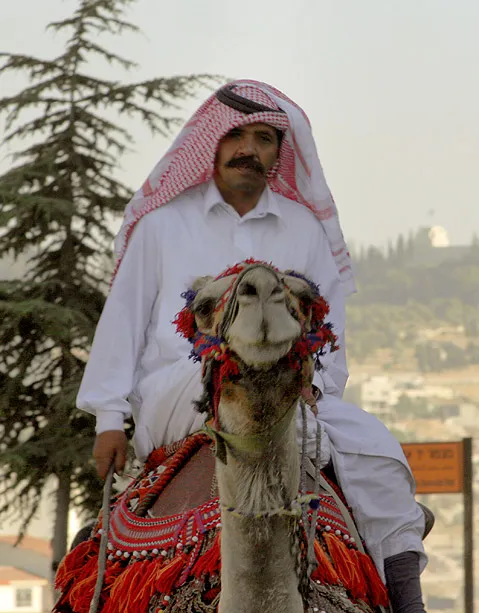 גבר בלבוש ערבי מסורתי רוכב על גמל המקושט בגדילים וחרוזים צבעוניים. ברקע המטושטש נראים מבני אבן ועצים האופייניים לנוף ירושלים.