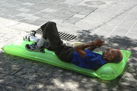 To keep the cart from rolling down the steps, the man pushing it steps hard on this rubber tire.