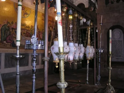 Churches & Monasteries \ Lampadas - hanging oil lamps over the Anointing Stone - Church of the Holy Sepulcher