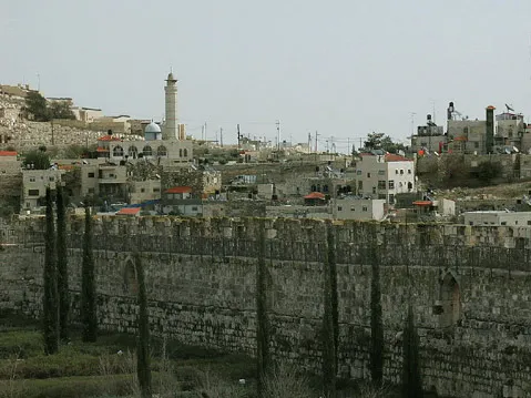 A view of the ancient stone fortifications of the Old City, lined with tall cypress trees. Behind the walls, a dense cluster of residential buildings and a mosque minaret rise against the sky.