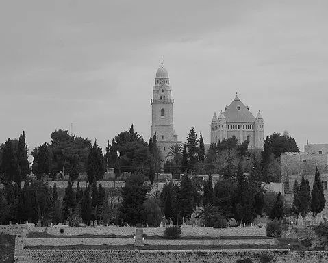 A black and white photograph capturing the skyline of Mount Zion. The image features the distinct Minaret of Omar and the large domed structure of the Dormition Abbey rising above a line of cypress trees and stone walls.