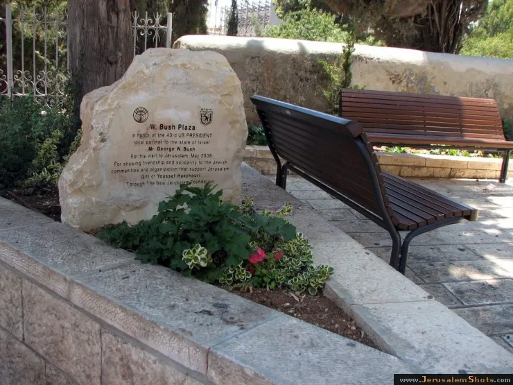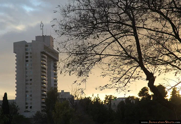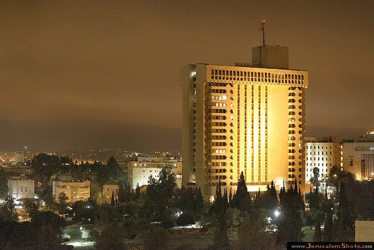 An elevated view of the stone walls and ancient buildings at night, with people walking through the plaza.