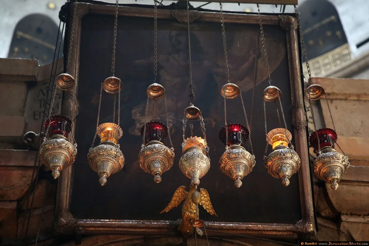 Church of the Holy Sepulchre \ Lampadas - hanging oil lamps over the Anointing Stone - Church of the Holy Sepulcher