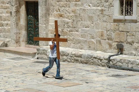 This shot was taken in the courtyard of the Church of the Holy Sepulchre. I'm not sure where this young man was going with the cross.