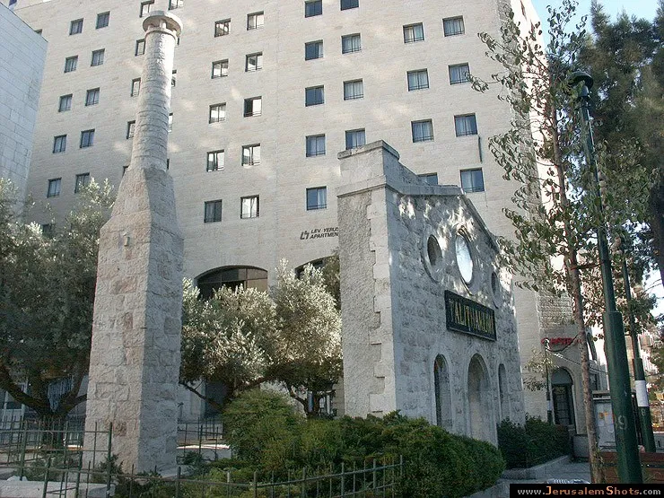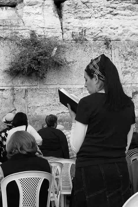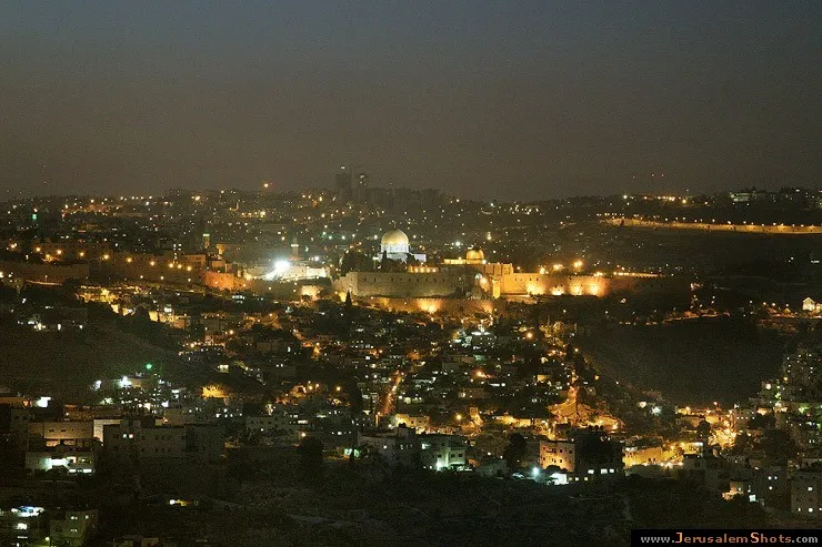 A black and white wide shot showing the dense urban landscape of Jerusalem's Old City, featuring prominent architectural features like domes and towers.