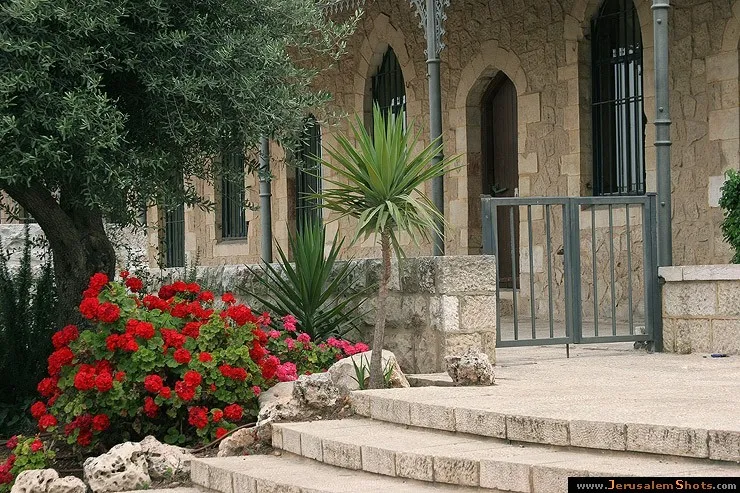 מבט יפה על גרניום אדום שפורח ברובע ימין משה השלוו. מבני האבן וצמחייה עשירה הם אופייניים לאזור היסטורי זה של ירושלים.