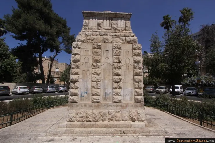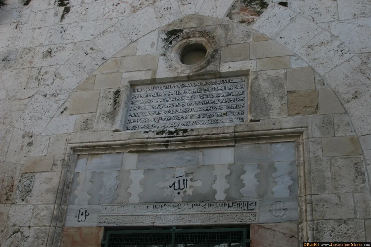 תצוגה מפורטת של קיר אבן גיר הכוללת קשת אבן ולוחות מלבניים עם כתב ערבי. הכתובת המרכזית מציגה בולטות את שם האל, בתוך אלמנטים אדריכליים אסלאמיים מסורתיים האופייניים לירושלים.