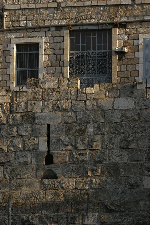 תקריב של קיר אבן ישן עם שני חלונות מוגנים בסורגי ברזל בקומה העליונה. אור השמש מדגיש את מרקם אבן ירושלים ואת הניגוד בין האבנים החלקות למעלה לאבנים הגסות יותר למטה.