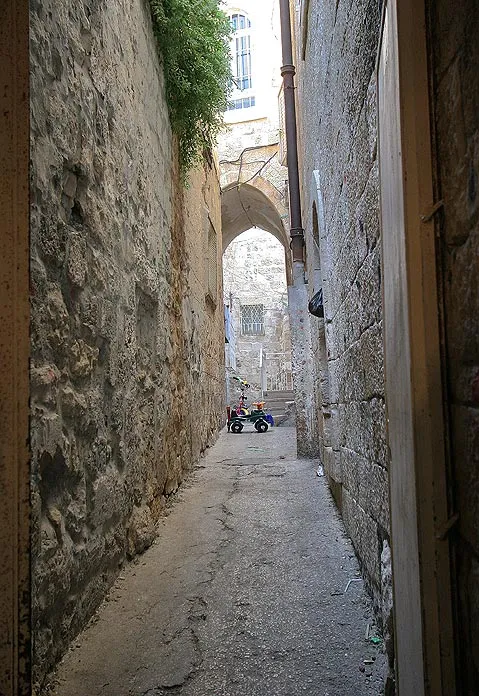 מעבר צר המוקף בקירות אבן גבוהים מוביל לעבר קשת אבן. קטנוע חונה בהמשך הדרך, וצמחייה משתלשלת מהקיר משמאל.