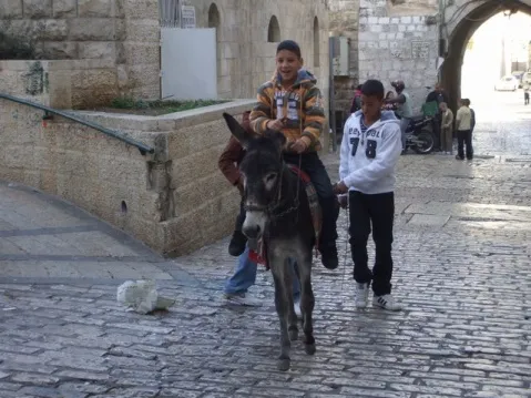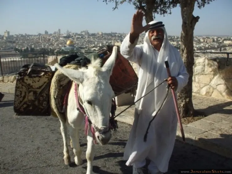 סולימאן והחמור פיטר, מראה ציבעוני בא-תור סוף הר הזתים. תמורת כמה שקלים תקבלו ברכה ותוכלו להצטלם עם שני המכובדים.