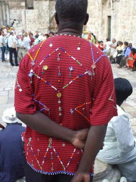 צליין-תייר מקניה ברחבת כנסיית הקבר. שימו לבלחולצה המיוחדת. צילום נופי ר