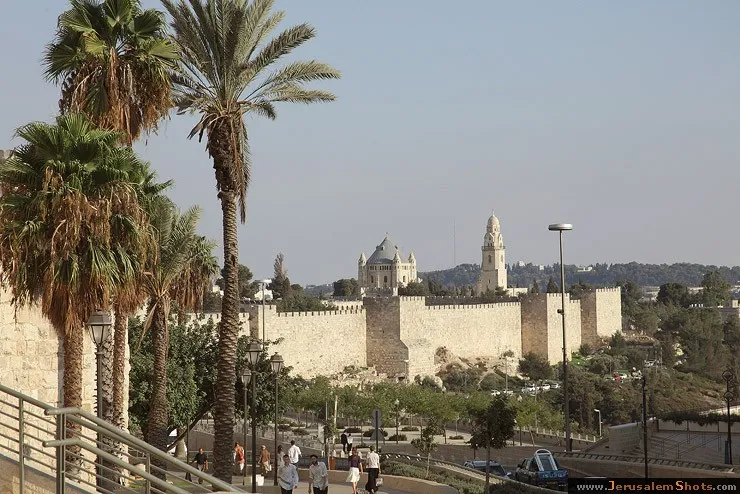 מבט על חומות האבן העתיקות של העיר העתיקה בירושלים, כשעצי דקל גבוהים מופיעים בחזית התמונה.